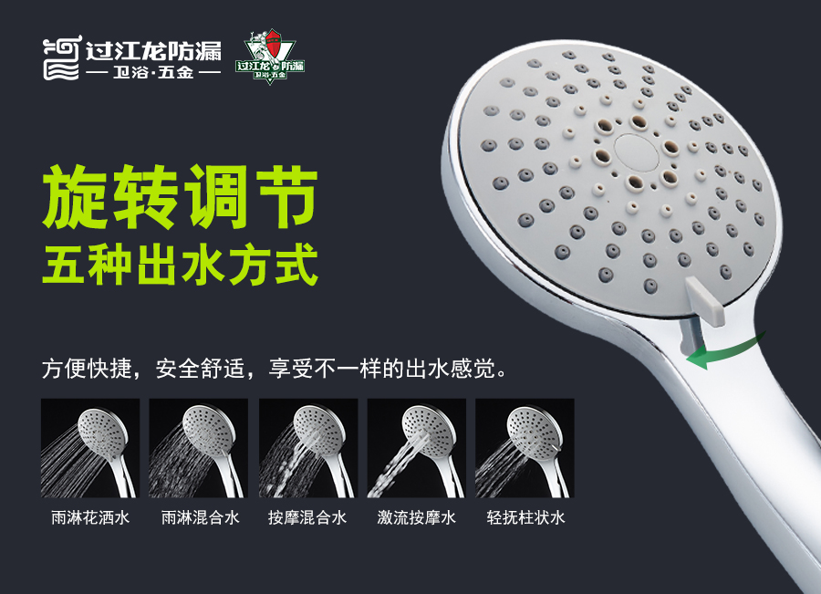 大花灑,帶來大不一樣的感覺!五功能花灑出水方式包含:激流按摩水、輕撫柱狀水、雨淋花灑水、按摩混合水、雨淋混合水。任意切換出水,讓淋浴樂趣十足。110MM超大花灑盤,在增加水流覆蓋麵的同時,充沛的水流量讓肌膚舒適更放鬆。